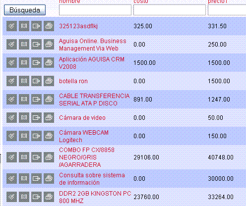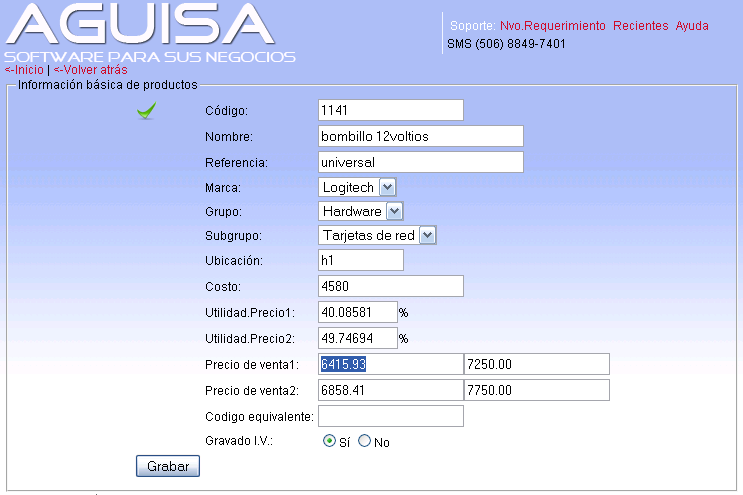 Los precios de costo, utilidad, precio de venta y precios de ventas IVI, se modificarán automáticamente según sea necesario para hacer coincidir la relación entre ellos, tanto para el precio 1 como para el precio2. Maestro de productosPara mantener el catálogo o maestro de productos, utilizamos la primera opción del menú principal del módulo de Inventarios AGUISA 2009. Esta opción nos mostrará la siguiente pantalla:
