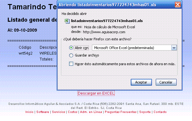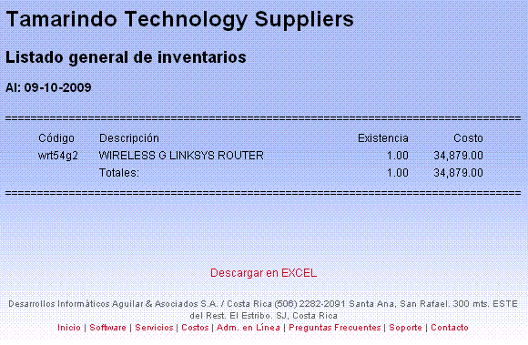 Descargar archivo de inventarios en formato .xlsMediante esta opción, usted podrá acceder a un archivo en formato xls, que le permitirá dar el tratamiento que usted requiera a través de esta herramienta.Mediante la opción Listado General de Inventarios, ubicada en el módulo de inventarios, usted podrá acceder a un listado similar al siguiente (tiene solo un producto para el ejemplo): Finalmente, el programa (instalado por terceros) de hoja de cálculo predeterminado, le abrirá el archivo descargado: