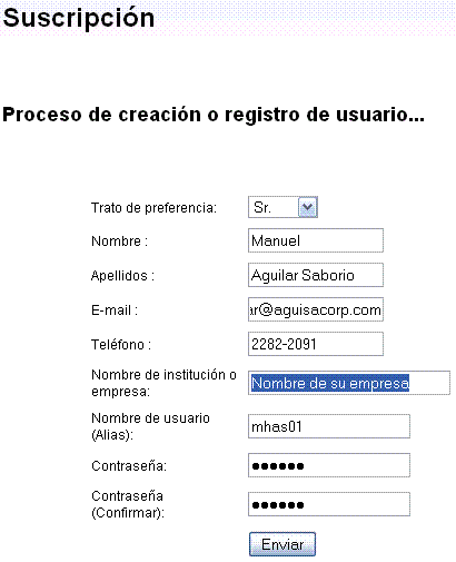 Primeros pasosEste manual pretende introducirle a grandes rasgos el sistema AGUISA OnLine. Si usted lo desea, puede consultar este manual para obtener la última versión del mismo. De todas formas, uno de los principales objetivos consiste en brindar la mayor cantidad de ayudas para el usuario directamente a través de la misma herramienta, por lo tanto usted debería considerar este documento como informativo / introductorio y no como la guía oficial. La guía oficial serán las ayudas visuales que puedan ser incorporadas sobre la marcha de la evolución de la aplicación en línea. Registro de UsuariosAGUISA OnLine es software a través de un servicio de suscripción. Por tal razón para usted poder utilizar nuestros sistemas es necesario que cree una cuenta de usuario la cual le va a permitir a usted tener acceso rápido, conveniente y en cualquier lugar a las aplicaciones que usted requiere para realizar su trabajo de una manera más eficiente y apoyado con la más avanzada tecnología en herramientas de computación. En la página de inicio www.aguisacorp.com, en la parte derecha de la página, usted encontrará el área de clientes. Si usted ya creó su cuenta de usuario y su contraseña, proceda a ingresarla en esta área y presione el botón ingresar. Si usted ya se registró pero no recuerda su contraseña, puede solicitar esta contraseña indicando su correo electrónico. Para esto, presione el vínculo que dice Click aquí, después de la pregunta ¿Olvidó su clave?. Si usted aún no se ha registrado, usted puede utilizar el vínculo Regístrese aquí que encontrará debajo del vínculo para recuperar la clave, después de la pregunta ¿NUEVO?